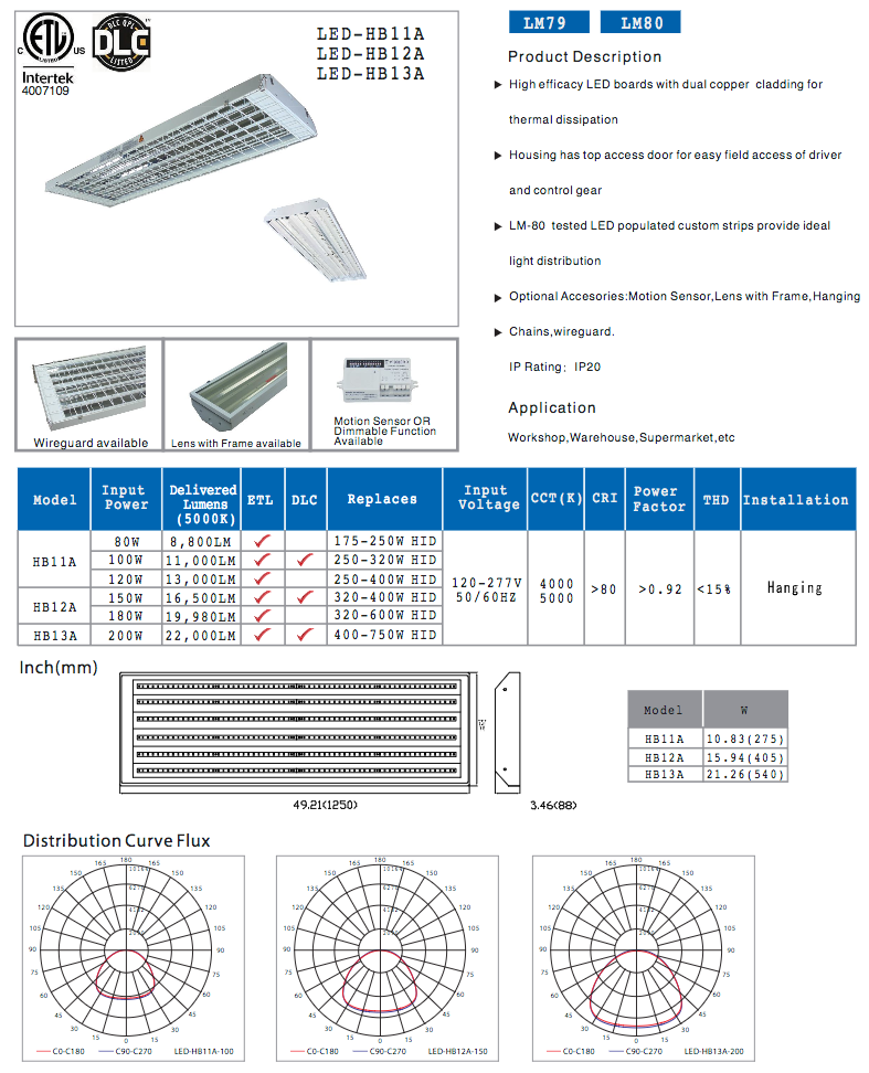 High efficiency LED boards with dual copper cladding for thermal dissipation. Clear PC lens is available upon request. Housing has top access door for easy field access of driver and control gear. LM-80 tested LED populated customs strips provide ideal light distribution. IP rating:IP20.